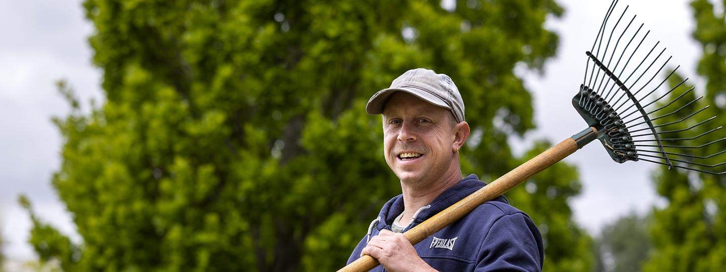 ‘Elke dag is hier anders. De ene dag vul ik gaten in het parkeerterrein, de andere dag veeg, snoei of schoffel ik. Deze afwisseling vind ik fijn. En wat een geluk dat ik lekker buiten met de natuur mag werken! ’s Ochtends loop ik altijd eerst een rondje met de klok mee om het gebouw. Daarna weet ik precies wat er moet gebeuren.’