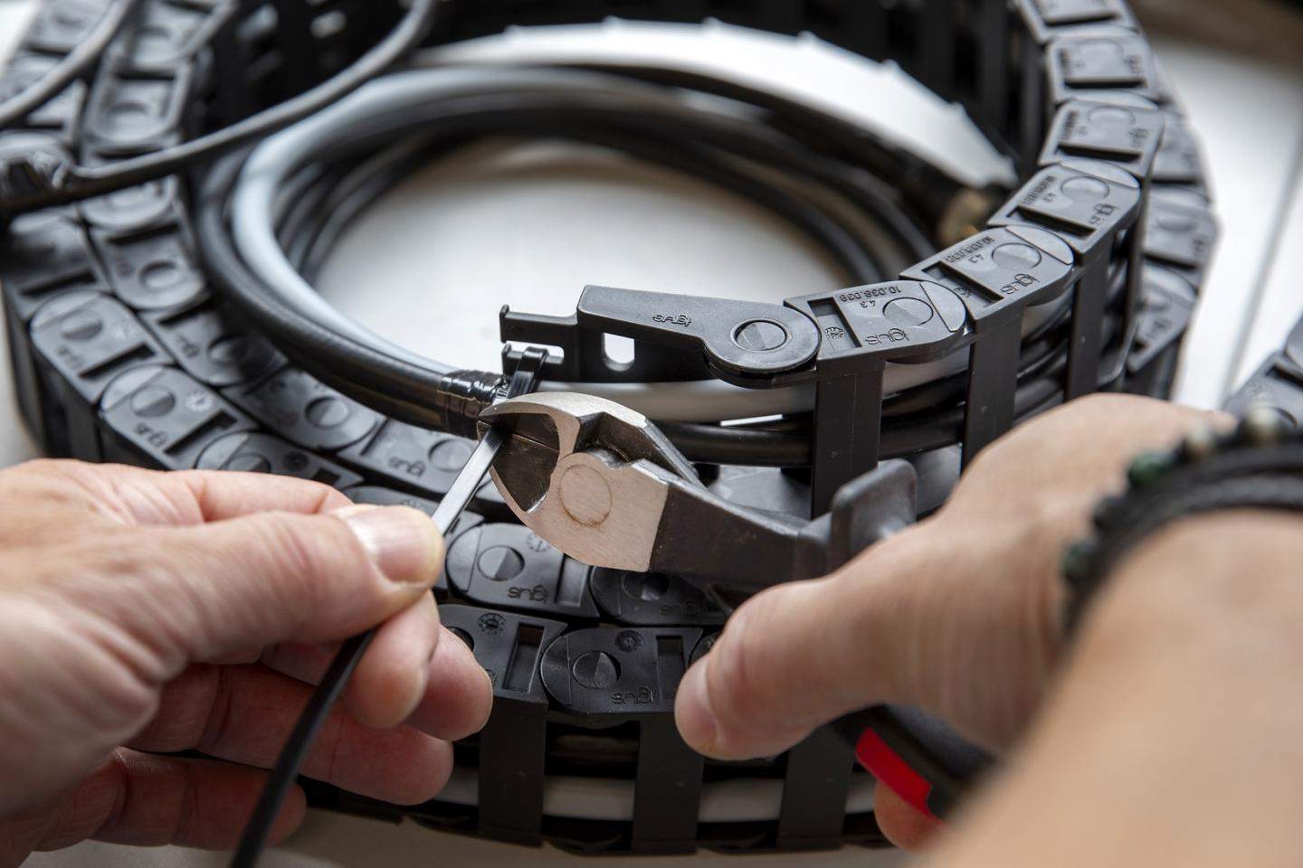 Kabels worden vastgezet in de beschermrups. Zo raken ze niet beschadigd als ze samen met de camera omhoog worden gestuurd om over het terrein heen te kijken.