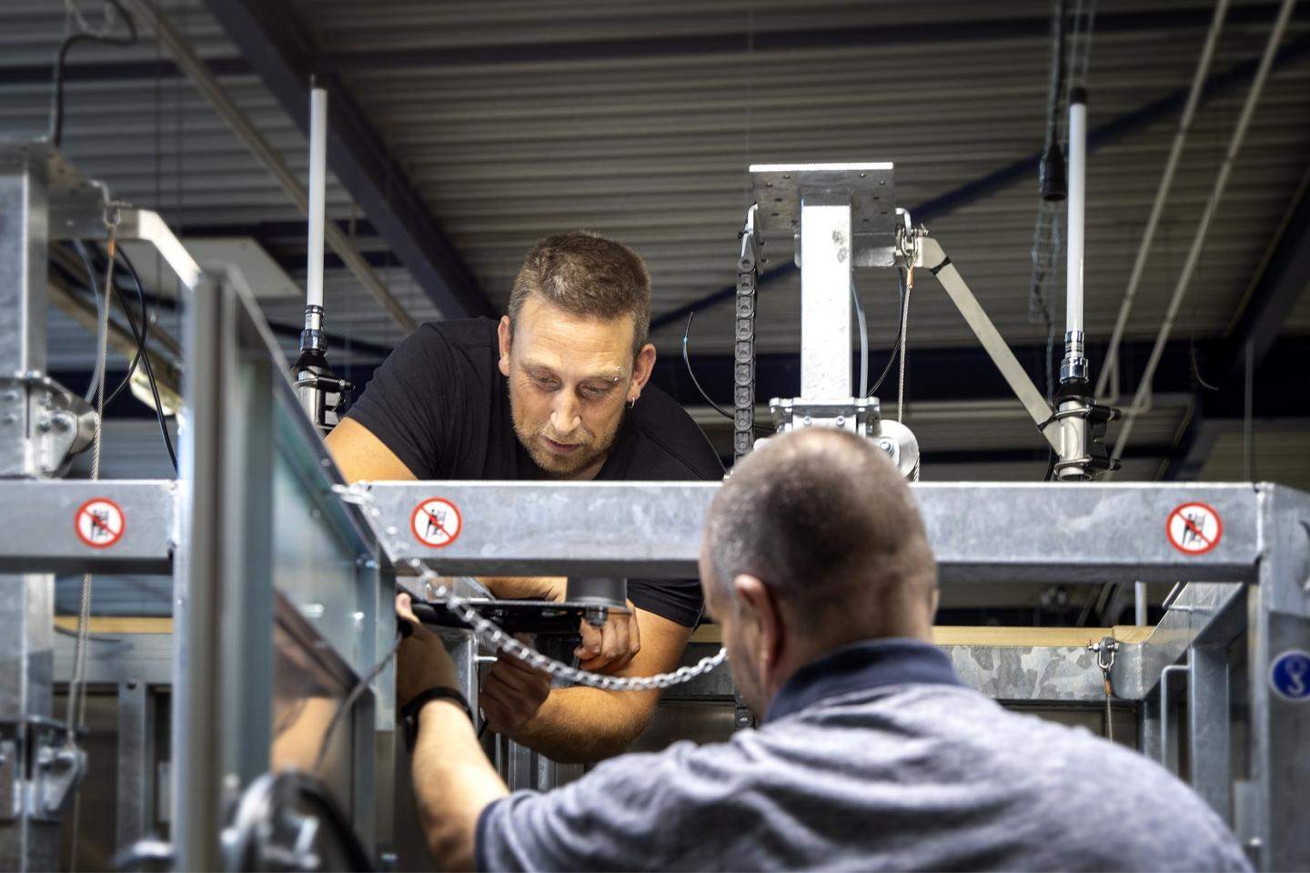 De houten stellage is speciaal voor dit Kooi-project gemaakt, zodat de medewerkers op hoogte kunnen werken. Prettig én snel. Per week maakt Caparis maar liefst tien UFO’S.