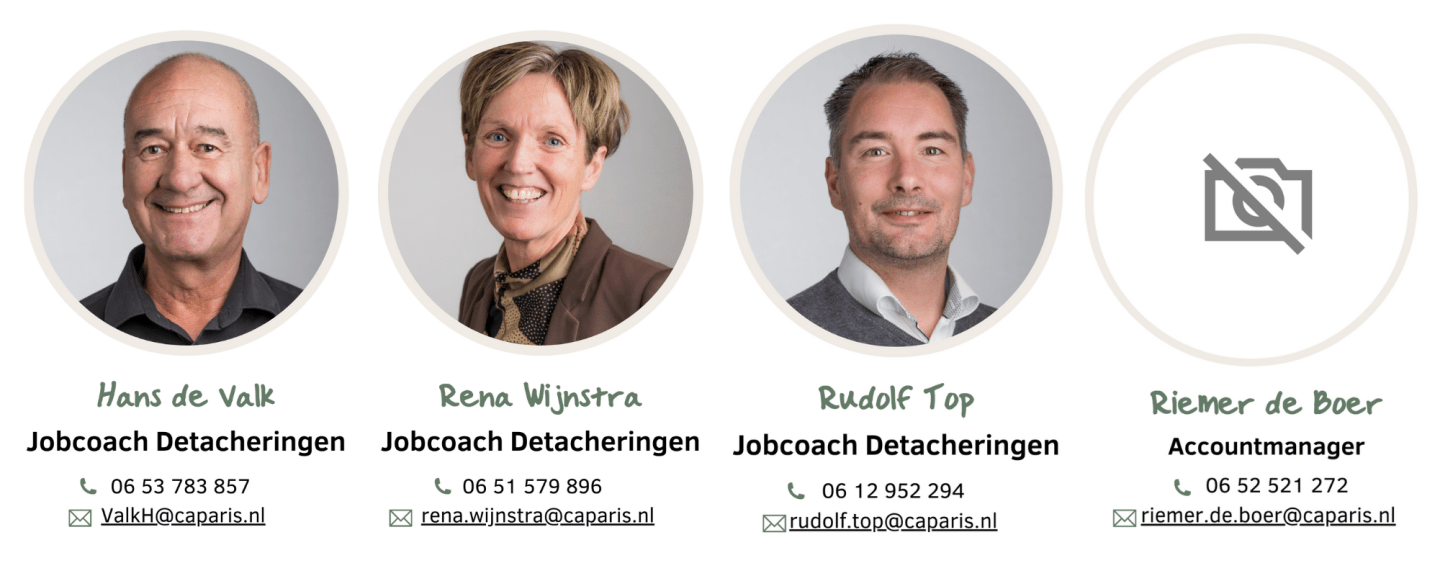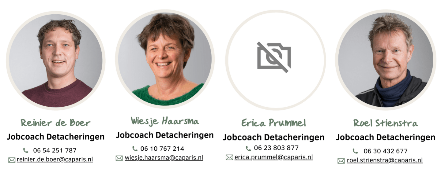 Onze jobcoaches uit het team Detacheringen begeleiden medewerkers, individueel of in een groep, die gedetacheerd zijn bij een werkplek buiten Caparis. De jobcoach houdt vinger aan de pols en kijkt of het klikt en werkt met de medewerker(s) binnen het bedrijf. Is de medeweker helemaal op z’n plek? Dan laten we hem of haar steeds meer los. Onze jobcoaches zijn er ook voor werkgevers. Bijvoorbeeld bij vragen over het omgaan met de beperking van een medewerker.